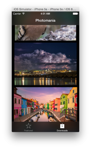 生成并运行您的应用,然后找到某个您最喜欢的图片,单击动作按钮,接着单击Download Photo按钮。目前您还不会看到任何的回应,但是回到应用主界面来,然后单击Downloads标签,这时您就可以看到您下载的照片了。