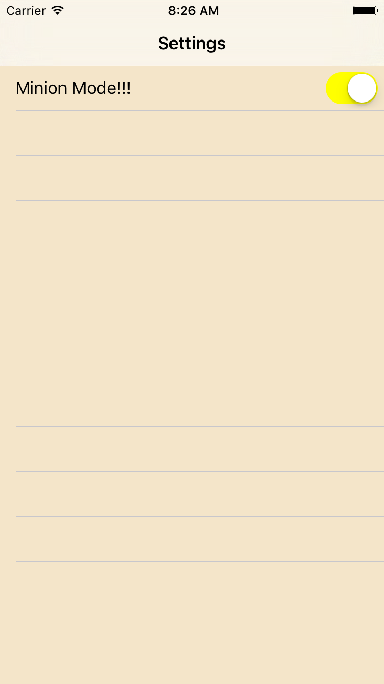 我将会使用一个简单的例子。一个只有一个设置选项的设置页面,把应用设置为Minion模式,当然你也可以扩展为多个设置选项。